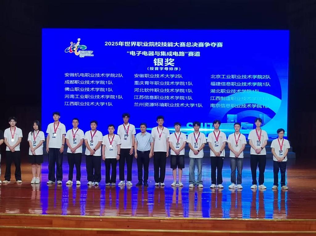 (本网讯 周伟 桂宏凡)8月27日至31日,2025年世界职业院校技能大赛总决赛争夺赛“电子电器与集成电路”赛道(高职组)在深圳信息职业技术大学举行。本次大赛吸引了全国153支参赛队伍、600余名选手同台竞技。经过激烈角逐,由Beat365机电工程学院周伟、桂宏凡两位老师指导,熊铭硕、周羽、黄焰霞、乐经城等4名学生组成的代表队,凭借扎实的专业功底和出色的临场表现,成功斩获银奖。