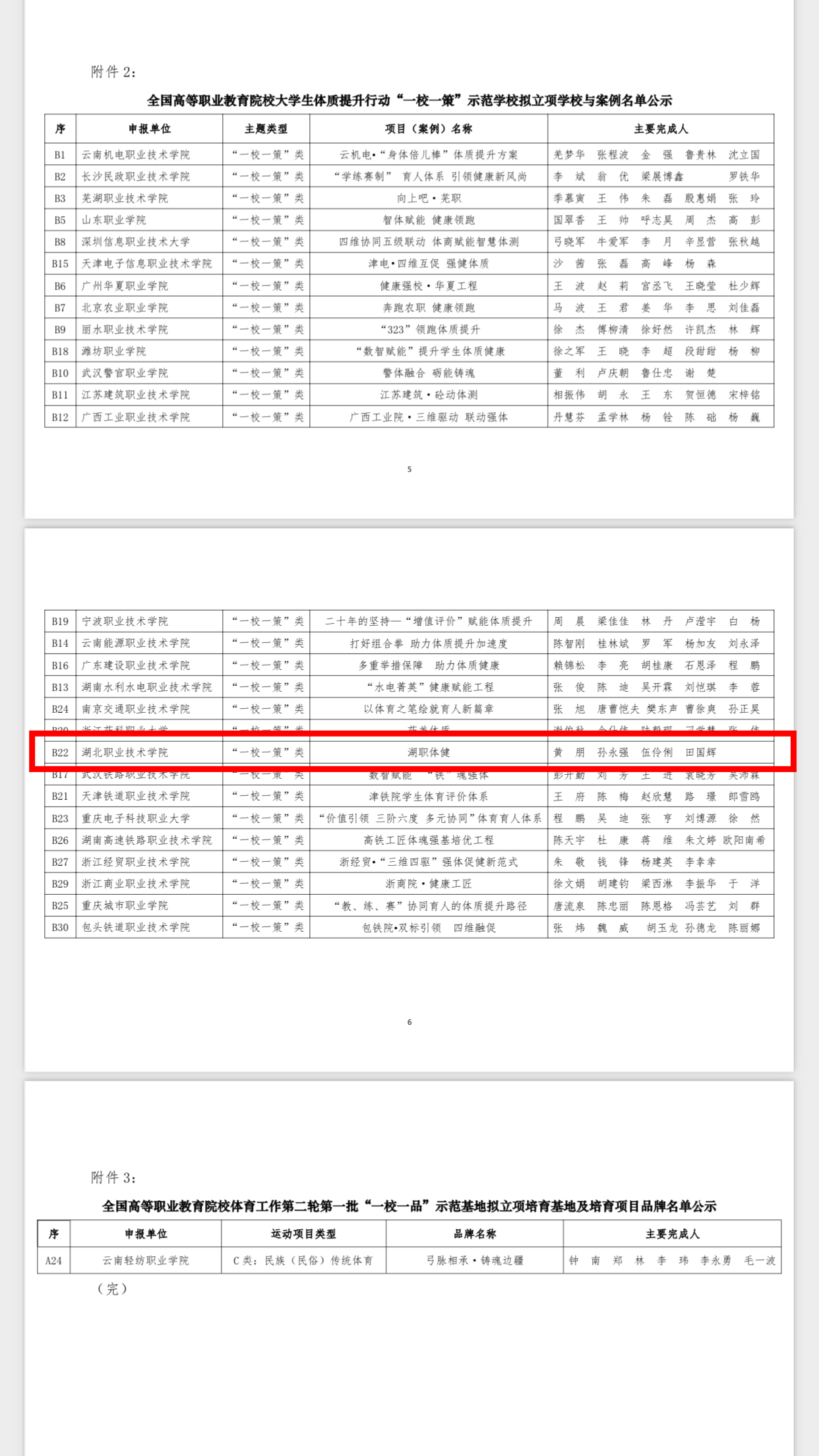 (本网讯 黄朋)近日,中国学生体育联合会高等职业教育院校工作委员会公布了全国高等职业教育学院第二轮第一批“一校一品”示范基地和大学生体质提升行动“一校一策”示范学校立项单位及项目品牌(案例)评选结果。Beat365体育部教师黄朋、孙永强、伍伶俐、田国辉共同申报的《湖职体健》案例成功入选。