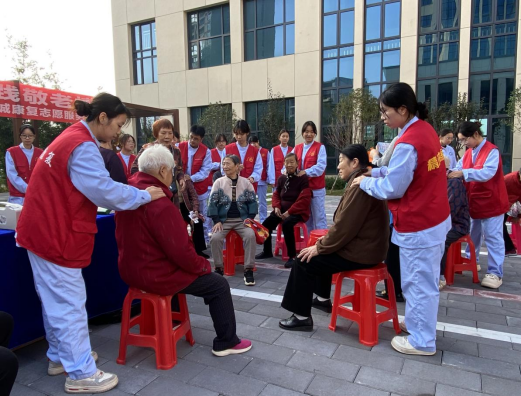 文艺表演同期,医疗志愿服务区同样热闹有序。口腔医学院与护理学院的师生们搭建起专业问诊台,聚焦社区居民健康需求,提供细致周到的身体健康问诊服务。问诊过程中,师生们耐心倾听居民诉求,详细询问身体状况、既往病史及生活习惯,针对常见的呼吸道疾病、关节不适、慢性基础病等问题,结合专业知识给出科学诊疗建议与健康管理方案;同时还向居民普及秋冬季节疾病预防、合理用药、膳食搭配等健康知识,帮助大家提升自我保健意识。卫生技术学院的志愿者们则发挥专业所长,在现场设置拔罐、按摩服务专区,为饱受肩颈酸痛、腰背不适困扰的居民提供理疗服务。志愿者们手法娴熟,力度适中,一边操作一边讲解保健知识,让居民们在舒适体验中缓解身体疲劳,不少居民竖起大拇指称赞:“大学生们技术专业、态度也好,真是实实在在为我们办实事!”