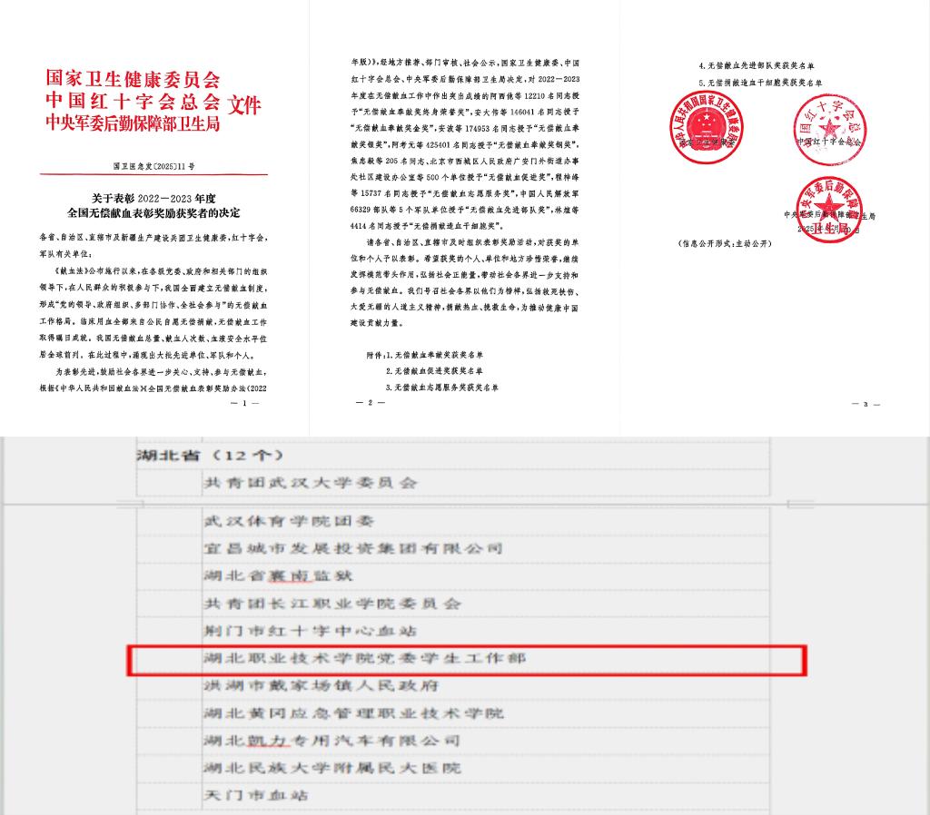 2022-2023年度,全校共有5373名师生积极响应号召,主动参与无偿献血,累计献血量高达159.5万毫升。这份沉甸甸的“热血成绩单”,凝聚着每一位献血者的爱心与担当,也见证了学校在无偿献血组织动员、宣传引导、服务保障等方面的扎实工作。多年来,学校已先后斩获“全国红十字模范单位”“湖北省无偿献血最美高校”“全市无偿献血促进奖单位”等多项荣誉,多名师生凭借长期的公益坚守,荣获“全国无偿献血奉献金奖”“全国无偿献血促进奖(个人)”等表彰,形成了“人人愿为公益、人人可为公益”的良好校园生态。