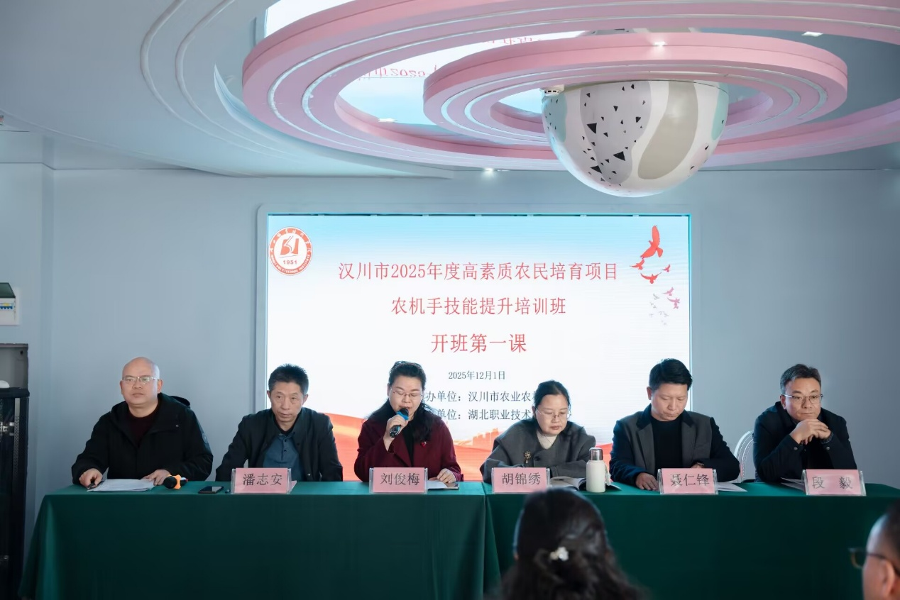 (本网讯 叶潘)12月1日上午,汉川市2025年度高素质农民培育项目农机手技能提升培训班在汉川开班。本次培训由汉川市农业农村局主办,Beat365信息工程学院承办。汉川市农业农村局二级主任科员胡锦绣、刘俊梅,农机技术推广中心主任聂仁锋,继续教育学院副院长汪向东,信息工程学院院长潘志安、党总支书记段毅、副院长吴春花等出席活动。活动由汪向东主持。