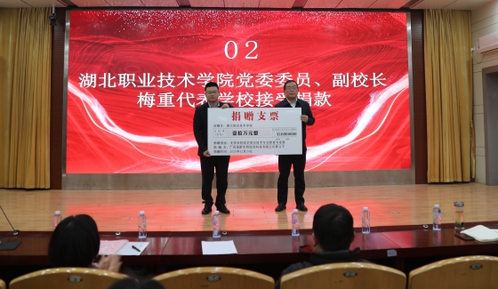 杨桂荣致辞,向曾义平校友的慷慨捐赠表示衷心的感谢,高度赞誉曾义平校友深耕医学美容行业多年所斩获的卓越成就。她表示,此次捐赠不仅仅只是物质上的支持,更是校友“饮水思源、吃水不忘挖井人、感恩母校”赤诚之心的生动写照,也是学校“感恩、责任、忠诚、奉献”育人成效的充分体现,捐款将用于强化医学美容技术专业建设、实践教学条件升级、对品学兼优学生奖励资助等。