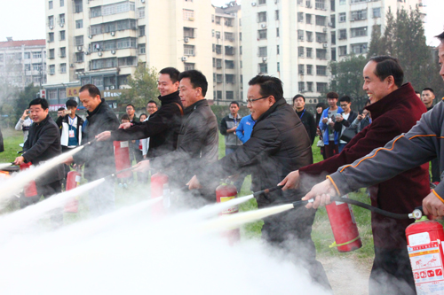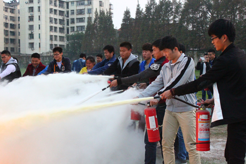 报告会结束后,在刘伟的指导下,全体参训师生在西区操场进行了灭火器灭火、消防水枪灭火等实战演练。