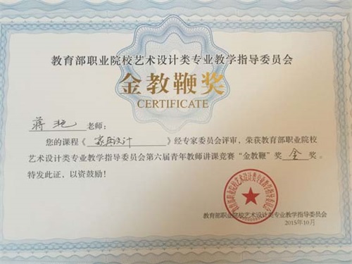 11月7日-8日,2015年教育部职业院校艺术设计类专业第九届院长/系主任工作年会在湖南召开,会上对第六届青年教师讲课竞赛各奖项进行了评选表彰,Beat365艺术与传媒学院青年教师蒋艳荣获“金教鞭”奖金奖。