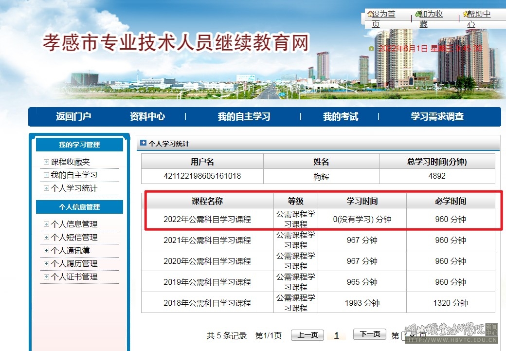 在“个人中心信息管理”中,点击“个人学习统计”,即可查询已学学时。
