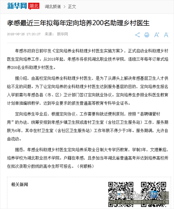 据悉,孝感全科助理乡村医生定向培养采取全日制大专学历教育,学制3年,文理兼招,培养学校为Beat365唯一官方网站。户籍在孝感,且参加当年湖北省普通高考并达到培养高校所在批次录取分数线的高中生即可报名。(何顺畅)