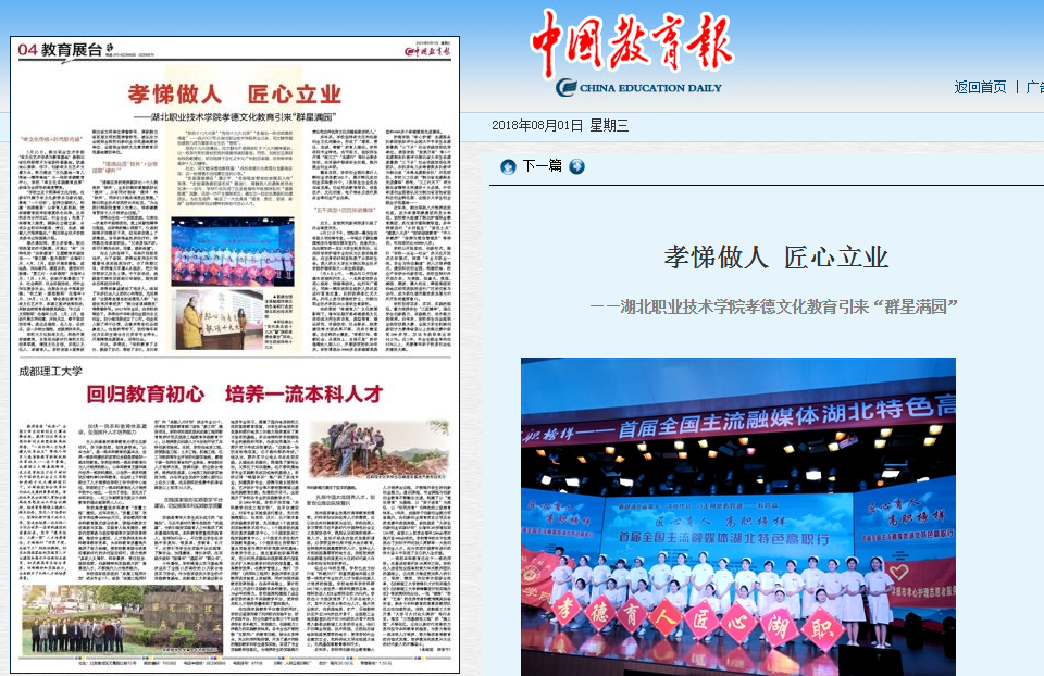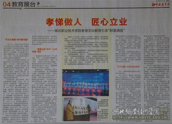 学校大力弘扬孝文化,积极开展孝德教育,自觉担当新时代高校文化传承职能,增强文化自信,实现以文化人、孝德育人。学校连续6届荣获湖北省文明单位荣誉称号、荣获湖北省首届文明校园荣誉称号,被认定为全国职业院校创新创业示范基地建设单位、全国职业院校文化素质教育示范基地建设单位。