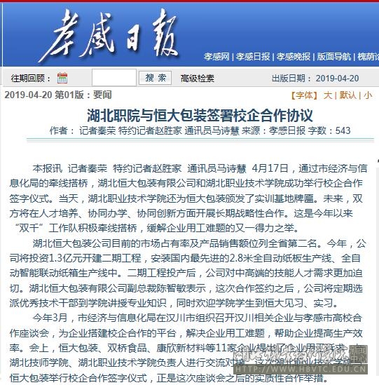 【孝感日报】湖北职院与恒大包装签署校企合作协议