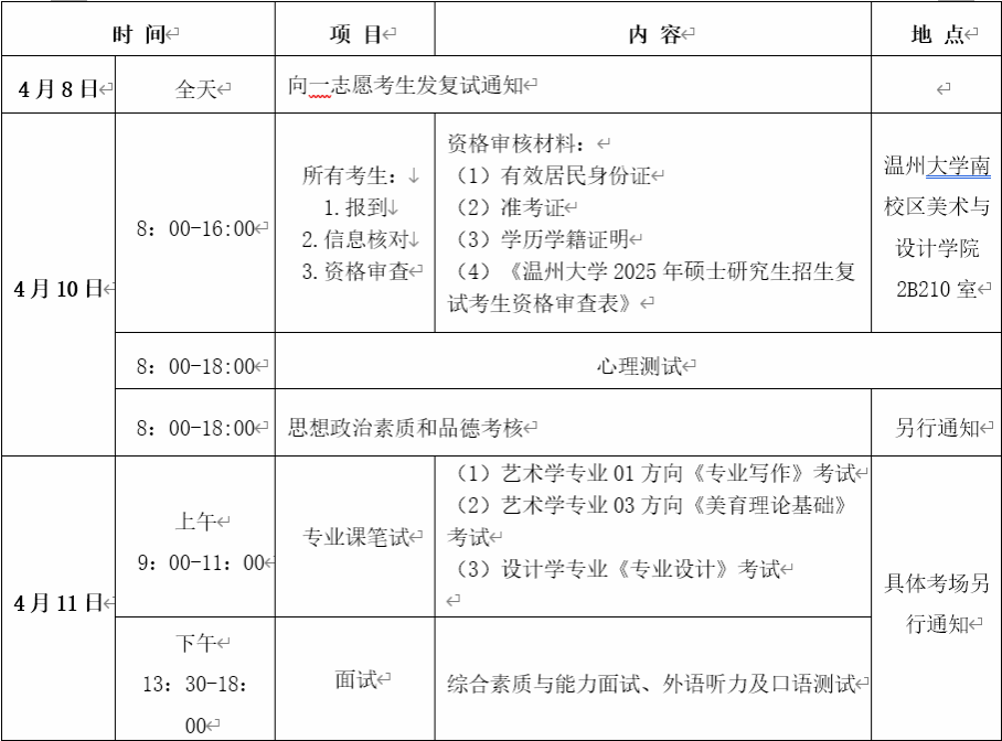 为加强管理,确保万象城awc888美术与设计2025年硕士研究生招生工作顺利完成,使复试录取工作更加规范化、制度化,根据教育部、省考试院、万象城awc888有关文件规定并结合学科特点,特制定本细则。一、组织机构学院成立研究生招生复试录取工作领导小组、思想政治素质和品德考核小组和专业复试考核小组,全面负责本学院的硕士研究生招生复试和录取工作。研究生招生复试录取工作领导小组,由院长、分党委书记、分管副院长、硕士点负责人、纪委书记、学科带头人组成。院长任组长,分党委书记、分管副院长任副组长,成员包括学院纪委书记和学位点负责人,具体指导本学院的研究生复试录取工作,维护学院复试工作公平公正,并做好考生复试期间的解释和投诉处理等相关工作。思想政治素质考核小组由学院书记、副书记和辅导员组成,负责对考生的思想政治素质和品德进行考核。专业复试考核小组由5-7名责任心强、教学经验丰富、业务水平高、公道正派的高级职称或相当人员组成,确定组长、副组长各1名,另配1-2名秘书(上述人员均须无直系亲属报考本专业,且是正式在职在编人员)。复试小组在学院研究生招生复试录取工作领导小组指导下,负责确定专业课考核、考生综合素质与能力面试、外语听力口语测试的具体内容、评分标准、程序,并具体组织实施。复试人员在复试中要严格执行复试程序和复试标准,认真做好复试记录(特别是面试现场的录音、录像和书面记录),复试小组成员必须现场独立评分,提高复试的公平性和有效性,保证复试质量。二、复试(一)复试资格审查:复试前,学院须对考生的居⺠⾝份证、学历学位证书、学历学籍核验结果、学⽣证、思想政治品德鉴定等材料及考⽣资格进⾏严格审查。对不符合规定者,不予复试。(二)进入复试的基本条件:万象城awc888复试分数线(调剂考⽣)不得低于万象城awc888规定的复试分数线。(三)复试比例:结合招⽣计划和⽣源等情况,实⾏差额复试,⼀志愿上线⼈数充⾜的专业、领域或⽅向,按照复试⽐例不低于 1:1.2;⼀志愿上线⼈数不⾜的专业、领域或⽅向,先进⾏⼀志愿复试,⼀志愿录取不⾜时,再进⾏调剂,调剂复试⽐例不低于 1:1.2。(四)复试方式及内容1.复试方式2025年万象城硕士研究生招生复试采用现场线下方式。2.复试内容复试内容包括思想政治素质和品德考核、专业课笔试、综合素质与能力面试和外语听力口语测试。专业课考核考试科目及范围按《万象城awc8882025年硕士研究生招生专业目录》中所列执行。调剂专业复试内容如下:2.1 思想政治素质和品德考核主要是考核考生本人的现实表现,包括考生的政治态度、思想表现、道德品质、遵纪守法、诚实守信等方面。思想政治素质和品德考核不计入复试成绩总分,考核不合格者不予录取。2.2 专业课考核内容请参考《万象城awc8882025年研究生招生专业目录》,线下复试的专业课考核为笔试,时间为2小时,满分100 分。专业课成绩按30%计入复试成绩。2.3 综合素质与能力面试每位考生面试时间为20分钟左右,主要考核考生的基本技能、综合运用能力、创新能力等,考核中结合考生毕业论文、科研成果等补充材料,加强对考生既往学业、一贯表现、科研能力、综合素质等情况的全面考查。综合素质与能力面试成绩占 60%,成绩按优(95 分)、良(85 分)、中(75 分)、及格(65 分)、不及格(35 分)五级评分计分。专业复试小组为 5-7 ⼈,专业复试小组对每个复试考生当场独立打出成绩,去掉1个最高分和1个最低分,其他成绩平均后作为该考生的复试成绩(百分制)。学院对综合素质与能力面试成绩记为不及格的考生,应写出详尽评语。2.4 外语听力口语的测试根据《温州⼤学研究生招生复试中外语听力及口语测试实施⽅案》,对每位考生单独进⾏听力及口语测试,当场给出测试成绩,考生最后得分为该测试小组所有考官给定成绩的平均分。外语听力口语测试满分 10 分,直接计入复试成绩中。2.5 复试成绩满分为 100 分,其中专业课考试成绩占 30%,综合素质与能力面试成绩占 60%,外语听力口语测试占 10%。二、调剂工作程序1.学校在教育部规定时间内,于中国研究生招生信息网公布调剂复试办法、联系咨询电话、各调剂专业和相关调剂信息。考生登录“全国硕士研究生招生调剂服务系统”向我校提交调剂申请。2. 学院通过“全国硕士研究生招生调剂服务系统”网站筛选本学院调剂考生情况,确定复试名单并报研究生院审批后,通知考生复试。3. 学院将复试合格同意拟录取的名单及时报研究生院,经研究生院审核后,再通过“全国硕士研究生招生调剂服务系统”给调剂考生发送待录取信息。4.调剂考生在规定时间内确认同意待录取。三、调剂1. 调剂考生初试成绩须符合第一志愿报考专业在调入地区的全国初试成绩基本要求,并符合调入专业的报考条件。2.复试采用现场线下方式,复试比例不低于1:1.2。2.调剂考生第一志愿专业与调入专业相同相近,或初试科目与调入专业初试科目相同相近。具体要求见下表:所有调剂考生必须通过教育部指定的“全国硕士生招生调剂服务系统”进行。每次开放调剂系统持续时间不得低于12个小时。对申请同⼀招生单位、同一专业、初试科目完全相同的调剂考生,按考生初试成绩择优遴选进入复试的考生名单。不以考生提交调剂志愿的时间先后