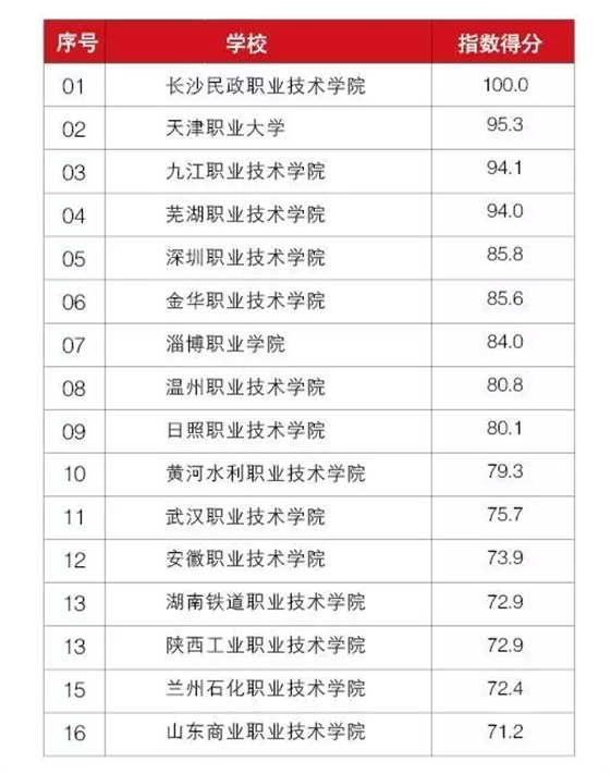 据悉,该榜单是中国传媒大学高等教育传播与舆情监测研究中心组建的高职院校媒体传播力课题组,以100所国家示范性高职院校为研究对象,历经半年多的研究成果。该榜基于各高职院校在传播方面的大数据和科学的指标体系而形成,是有关中国高等教育舆情的专业性研究报告,是对2015年度中国高等教育舆情发展景观的全面展示,是高等教育研究者和管理者进一步研究高等教育舆情的重要参考。人民日报《民生周刊》微信平台对这份榜单的前30所高职院校进行发布,完整的全国示范性高职院校媒体传播力报告和影响力排行榜将在2017年4月举行的“第一届中国高职院校影响力高峰论坛”上正式发布。