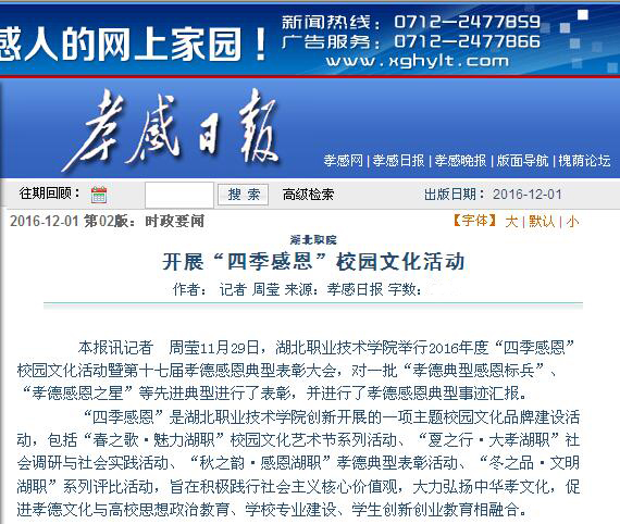“四季感恩”是Beat365唯一官方网站创新开展的一项主题校园文化品牌建设活动,包括“春之歌·魅力湖职”校园文化艺术节系列活动、“夏之行·大孝湖职”社会调研与社会实践活动、“秋之韵·感恩湖职”孝德典型表彰活动、“冬之品·文明湖职”系列评比活动,旨在积极践行社会主义核心价值观,大力弘扬中华孝文化,促进孝德文化与高校思想政治教育、学校专业建设、学生创新创业教育相融合。