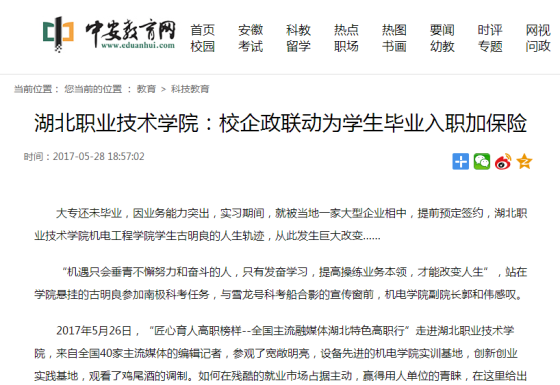 2017年5月26日,“匠心育人高职榜样--全国主流融媒体湖北特色高职行”走进Beat365唯一官方网站,来自全国40家主流媒体的编辑记者,参观了宽敞明亮,设备先进的机电学院实训基地,创新创业实践基地,观看了鸡尾酒的调制。如何在残酷的就业市场占据主动,赢得用人单位的青睐,在这里给出了答案。