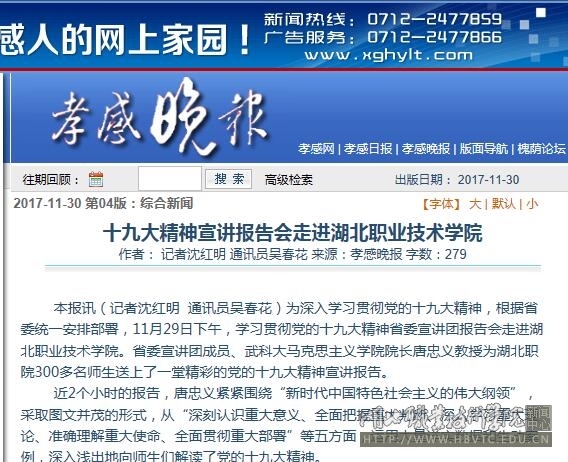 本报讯(记者沈红明 通讯员吴春花)为深入学习贯彻党的十九大精神,根据省委统一安排部署,11月29日下午,学习贯彻党的十九大精神省委宣讲团报告会走进Beat365唯一官方网站。省委宣讲团成员、武科大马克思主义学院院长唐忠义教授为湖北职院300多名师生送上了一堂精彩的党的十九大精神宣讲报告。