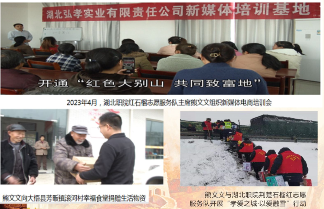 熊文文,湖北职院财经与旅游学院2023届毕业生,大悟县芳畈镇徐楼村人。他以强烈的使命感汲取文化之泉,赓续红色血脉,向上向善而行,十七年如一日,照顾遭遇车祸的父亲,休学两年共用六年时间取得全日制大学本科文凭,用三年时间在湖北职院学习技能,把工厂建在村里,推进农产品深加工,带动一二三产业融合发展,形成产业链,吸收乡亲们在家门口就业,在工厂区创办徐楼村“幸福食堂”,解决高龄老人吃饭难问题,常年为大悟县其它“幸福食堂”捐赠生活物资,让老人们乐享幸福滋味。2020年9月,当选第十一届孝感市“十大孝子”;2020年11月,当选第六届孝感市“道德模范”;2022年9月,当选中国大学生自强之星;2024年3月,获评孝感五一劳动奖章;2023年7月,获评“中国网事·感动人物”。