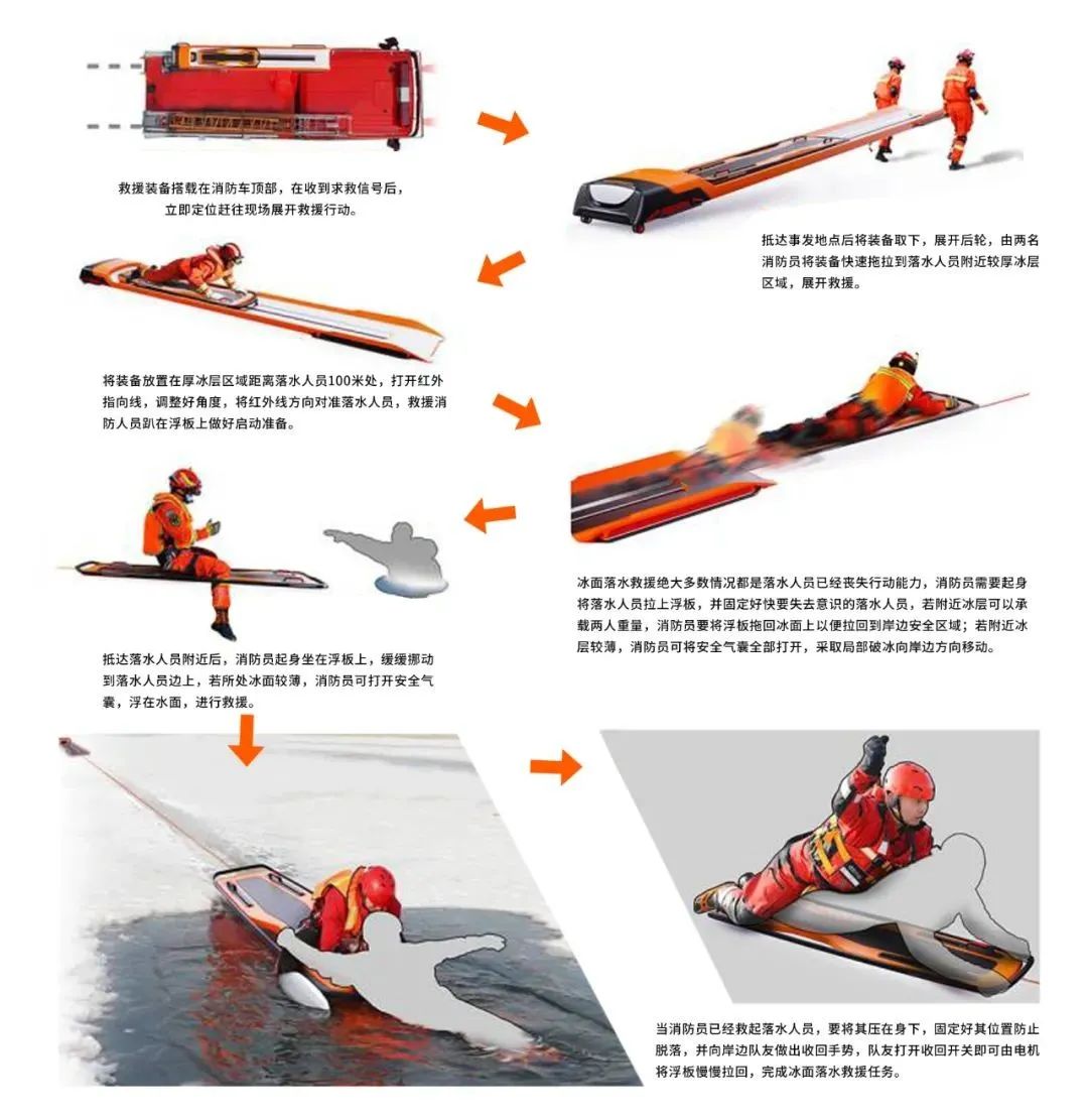 创新设计,智造未来。历届“市长杯”中国(温州)工业设计大赛聚焦温州“5+5”产业体系,挖掘设计新理念,涌现了大批优秀作品与设计师。冰域弹射救援浮板丨设计师:李家力&王靖林在我国北部地区常发生冰域事故,为此今年消防部门特此将冰域救援作为重点培训项目,于辽宁成立了全国冰域救援培训基地。冰域救援还存在很多问题:1.由于无法预测湖面冰层厚度,消防员实施救援时需要匍匐前进,需要增大与冰面的接触面,会导致救援时间增长。2.若是与受难者相距较远,会增长救援时间,短短的几分钟就有可能决定受难者的生死。3.若是实施救援区域在冰域破损较大的区域,冰面边缘存在较薄可能,浮板并不能同时支撑2人的重量。4.消防人员在接到报警时,并不知道救援区域状况,为此需要携带大量装备以应对各种状况,例如浮板、皮划艇、木梯子等等...通常不便于携带。(冷休克反应:落入冰水者呼吸会加快,大脑瞬间会因低温而失去意识,身体可能抽筋无法动弹。人在零下五度的水中最多存活10-20分钟,坚持不过“冷休克反应”阶段的人,只能存活3分钟左右。)I市长杯作品冰域弹射救援浮板这款冰域弹射救援浮板的创意点在于将救援距离分为远距离救援以及近距离救援两类: 针对近距离救援以及远距离救援两类。针对近距离救援,依靠消防人员人工滑行的方式迅速实施救援;针对远距离救援,依靠弹射装置弹射到能实施近距离救援的区域,再实施救援工作;同时针对冰面破裂区域较大的情况,设计可弹出的安全气囊,增大浮板与冰面的受力面。 通过该方式,能快速到达落水人员附近,缩短救援时间,为医疗人员争取了紧急救援时间,提高落水人员获救的几率。 由红外线测距,预估距离后,转换成动力数据给电机,由内部芯片计算后,再由电机迅速回拉,带动浮板延滑轨方向弹出。 由此可见,冰域弹射救援浮板不仅能够缩短救援时间,提高落水人员获救几率,同时能应对多种落水情况并适用于不同的环境状况。我们希望未来针对冰域事故能做出更加有效、快速的反应,优化消防人员救援流程的同时也确保消防人员与遇害者的安全。I使用流程