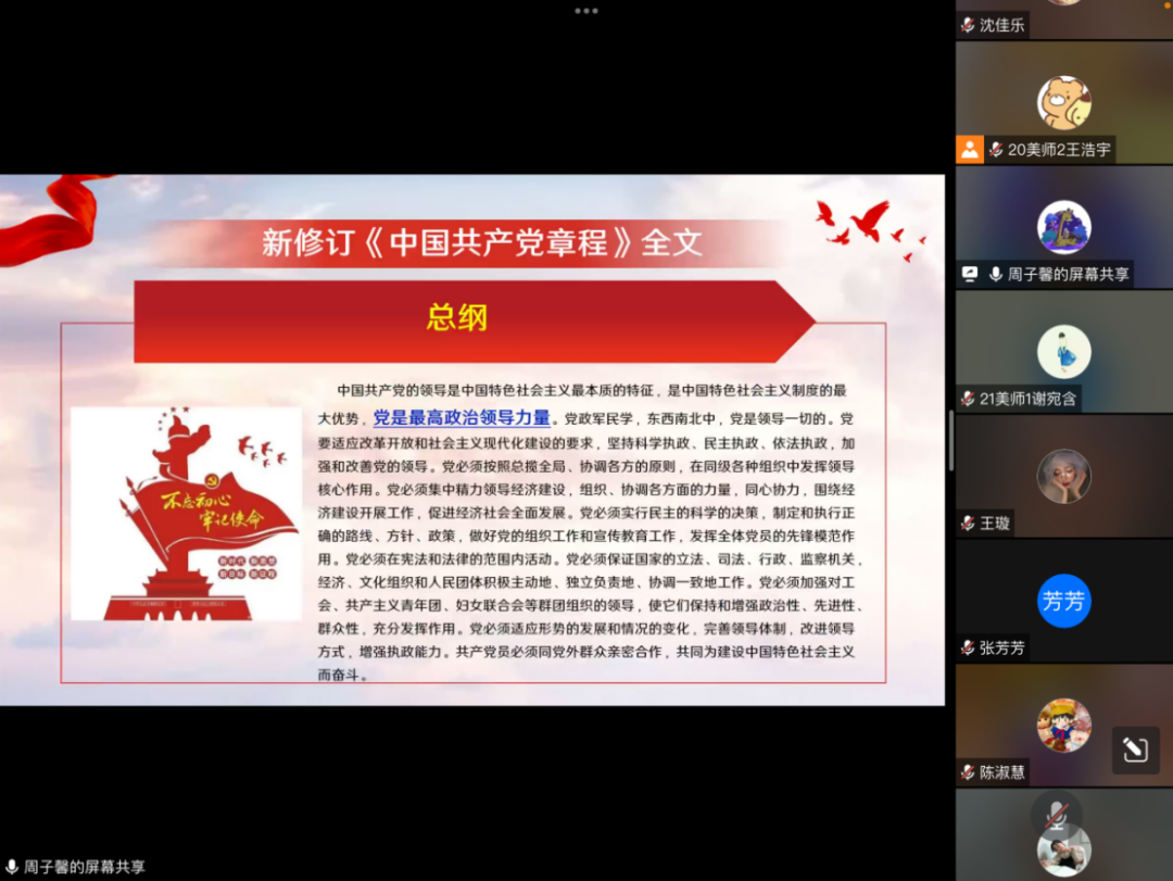 3月26日,万象城awc888学生第一党支部在线上通过学习《中国共产党章程(修正案)》,更加深入了解此次党章修改的工作过程、重大意义和主要内容。党章的一次次完善,体现了党的理论创新、实践创新和制度创新的时代特色;彰显了中国共产党人推陈出新、与时俱进的创造精神。