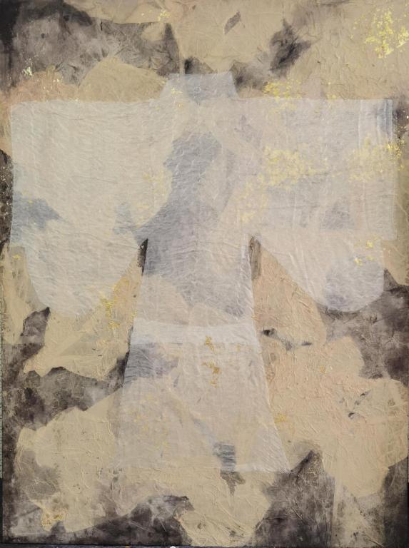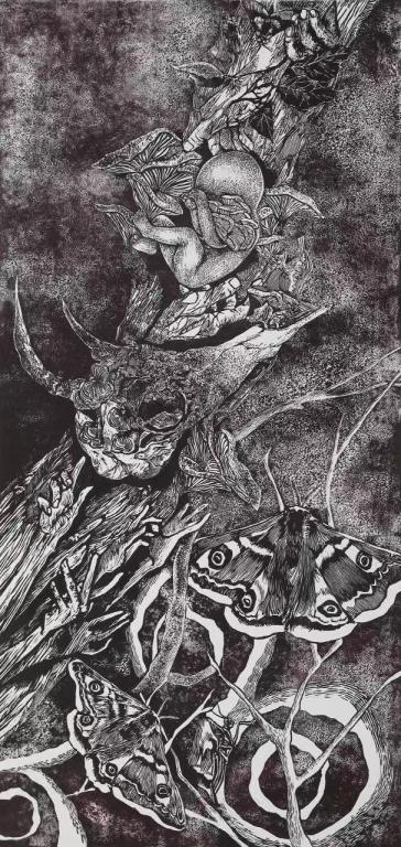 美师3班版画方向周钰媚同学的《沐•生》通过婴儿、树木植物、蝴蝶等物象元素,形成了一种对生命神秘性的描绘与表达,在黑白木刻中叠加木板木屑等综合媒材,采用了凹版与凸版相结合的印刷方法,画面即有黑白木刻简洁明快的力度,又呈现出细腻的肌理与黑白灰的层次感,充分体现了版画的印痕之美。