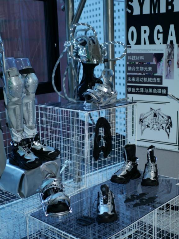 鞋履与饰品设计方向的17位毕业生作品,主题新颖多样,未来感十足,其产品类别和设计风格各式各样,男鞋、女鞋、童鞋,包袋、饰品、前卫、休闲、运动、机能风等都有涉及。从创意角度和产品转化来说有较大的突破,手工皮具、传统工艺、3D打印等的应用,既有传统元素的再现,也有元宇宙和赛博朋克风,更有创新的材料融合和面料再造。