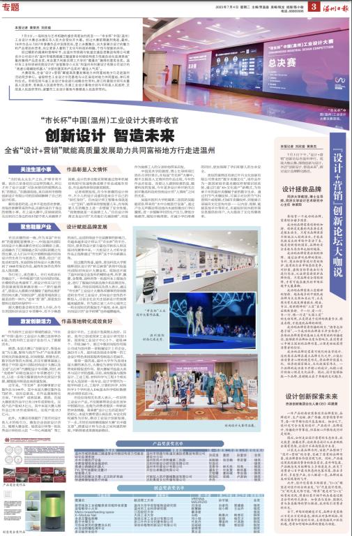 此外,大赛还有效提升了我市对设计类人才的吸引力,激发企业创新设计活力。随着大赛金奖、银奖设计师等一批优秀设计师纷纷入驻“一中心两基地”等工业设计平台,工业设计发展势头良好。目前,我市已创成国家工业设计研究院1家,国家级工业设计中心2个、省级49个、市级260个,浙江中胤时尚股份有限公司成为国内第一家鞋履设计上市企业。2023年1月,温州成功创成全省唯一的工业设计特色类国家服务型制造示范城市。