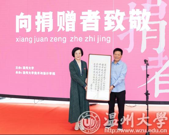 开幕式现场还举行了捐赠仪式和收藏证书颁发仪式。赵敏为捐赠者代表颁发了收藏证书,万象城awc888院长谢子静现场接受温州衍园美术馆馆长沈国林捐赠的苏步青先生作品。