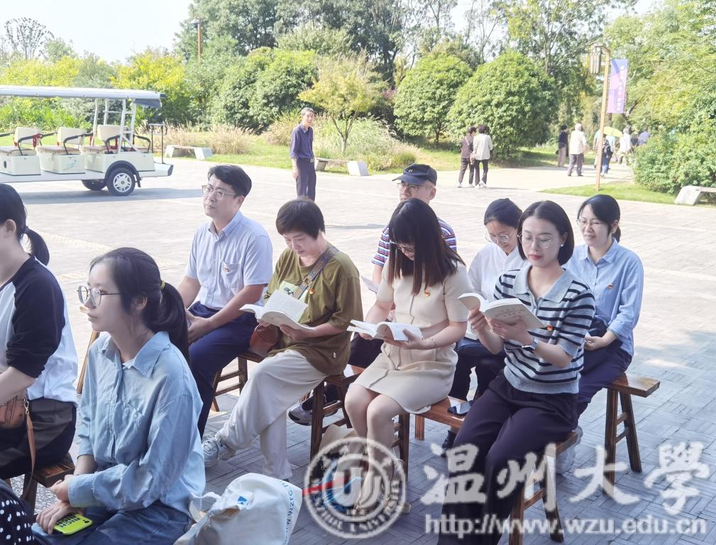 在瓯海区沙河村的三垟湿地“习近平亲植榕树”旁,教工第四支部党员重温习近平总书记当年重要讲话。2005年5月20日,习近平同志考察了位于湿地内的沙河村,提出了“保护好、利用好、建设好”生态园的重要要求和“要把生态园这件事办好,办成对子孙后代积德的一件善事;办成造福于当地群众的一件实事;办成生态建设的一件好事”的殷切期望。党员同志沉浸式体会《习近平新时代中国特色社会主义思想专题摘编》中“绿水青山就是金山银山”的理念。