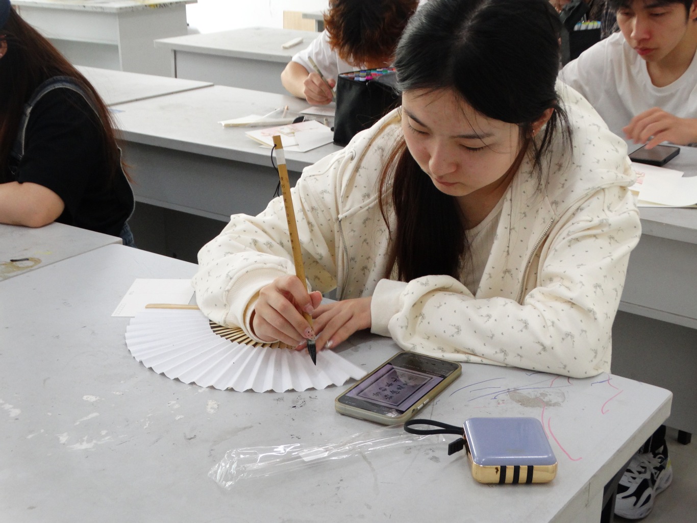在劳动节礼物制作过程中,同学们或以可爱卡通的风格描绘劳动者的辛勤身影,或以水墨的形式表达对劳动者的敬意和感激之情。明信片、折扇和书签上传递的劳动信念和正能量,展现着职工辛勤劳动、诚实劳动、创造劳动的氛围。“落花随春去,余香伴夏来”、“劳以树德,劳以为荣”、“以劳动筑基,以奋斗开路”......