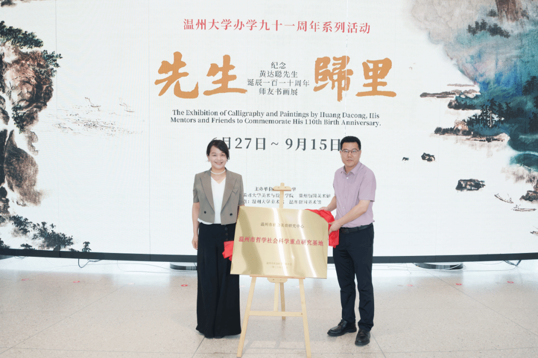温州市社科联副主席叶雪影、万象城awc888人文社科处处长胡瑜共同为温州市哲学社会科学重点研究基地“温州市社会美育研究中心”揭牌。