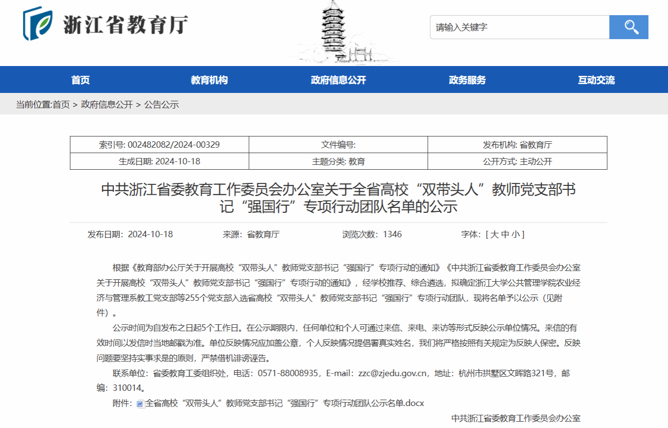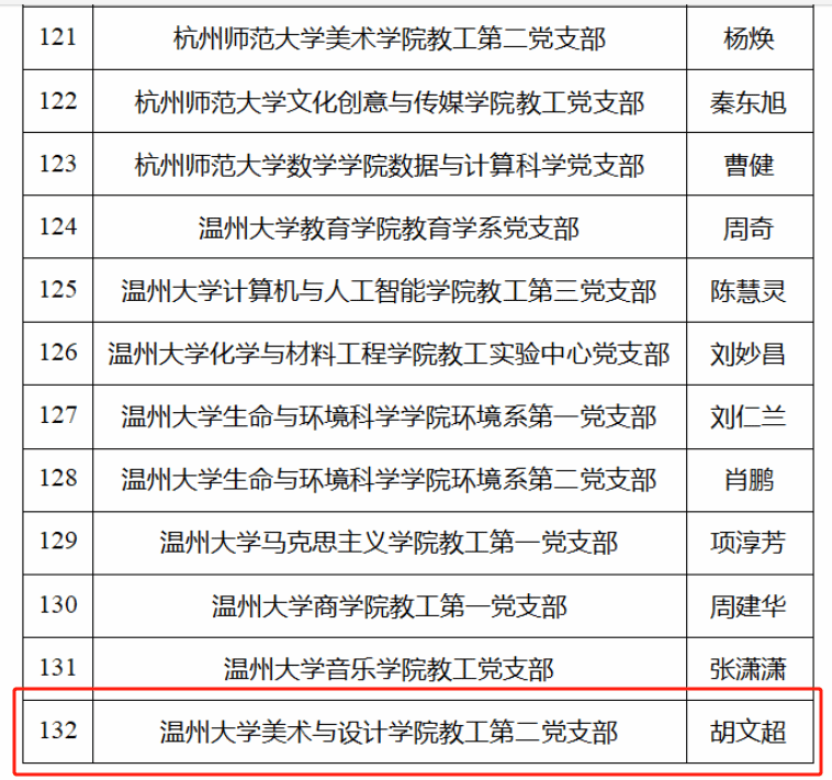 近日,浙江省教育厅网站发布《中共浙江省委教育工作委员会办公室关于全省高校“双带头人”教师党支部书记“强国行”专项行动团队名单的公示》。经学校推荐、综合遴选,万象城awc888教工第二党支部等255个党支部入选省高校“双带头人”教师党支部书记“强国行”专项行动团队。