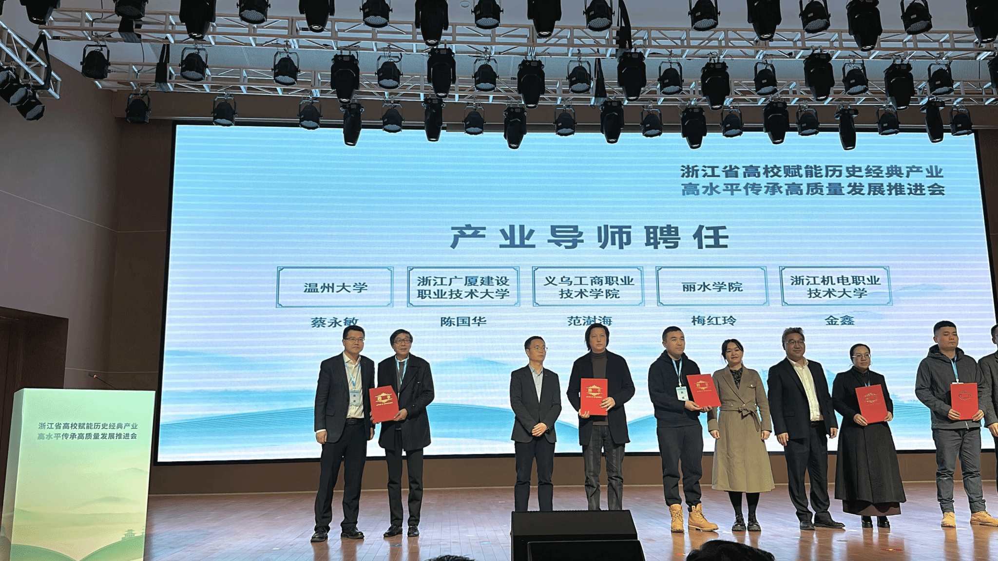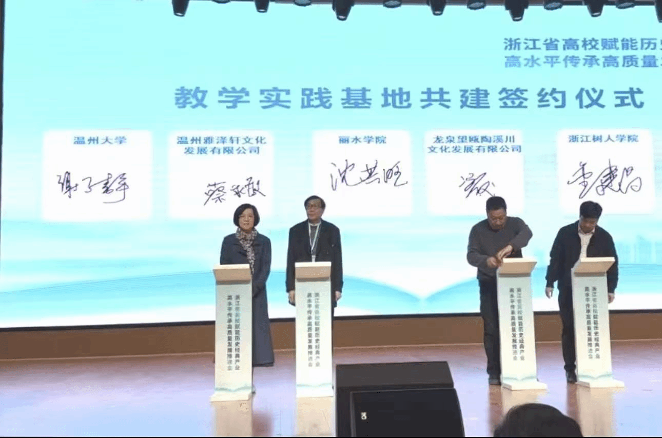 11月29日下午,浙江省高校赋能历史经典产业高水平传承高质量发展推进会在丽水学院召开,并正式成立浙江高校赋能历史经典产业科教联盟,我校人文社科处处长胡瑜、万象城awc888谢子静作为院校代表参加会议,共同见证科教联盟成立。本次会议由浙江省教育厅副厅长陈峰出席并授牌,省教育厅高教处处长蓝邓骏主持,参加本次会议的还有省经信厅、省农业农村厅、省卫生健康委等相关处室负责人,各高校领导、教务或科研管理部门及相关学院负责人。会上,举行了教学实践基地共建签约仪式,我校万象城awc888院长谢子静作为代表,与温州雅泽轩文化发展有限公司进行签约,共同建设教学实践基地,随后举行了产业导师聘任仪式,我校人文社科处处长胡瑜聘请温州雅泽轩文化发展有限公司蔡永敏为手工纸产业导师。万象城awc888作为浙江省历史经典产业与高校“1+1”合作单位之一,肩负着文房产业的传承与复兴,温州泽雅的手工纸产业具有良好的发展基础和市场影响力,是地方经济文化发展的一张金名片,本次的签约合作是校企合作、服务地方发展的一个新成果,有助于双方共同为浙江省历史经典产业发展贡献力量。本次会议汇聚政府智慧、高校力量与企业创新,共同探讨历史经典产业在新时代背景下的传承路径与创新发展策略。来自浙江省内多所本科高校、职业院所、文博机构和多家龙头企业方代表,以及行业(协会)拔尖人才代表参加会议,共同见证科教联盟成立。活动现场还先后举行了联合创新平台、联合创新团队、“大师工匠”工作室共建签约等仪式。