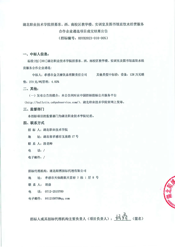 Beat365唯一官方网站招募东、西、南校区教学楼、实训室及图书馆直饮水经营服务合作企业遴选项目成交结果公告