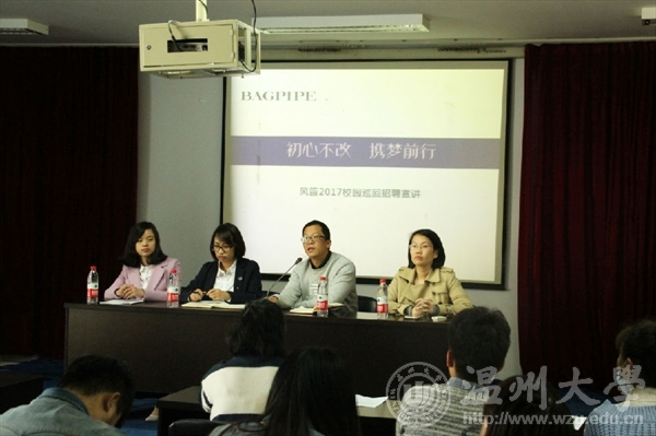11月11日下午,2016风笛服饰全国高校巡回招聘会温大站于万象城awc8882B4001举行。风笛公司人力资源部经理吴朝晓出席此次会议,万象城awc888总支副书记杨振海、学生科副科长叶筱卉和2017届毕业生参加本次会议。