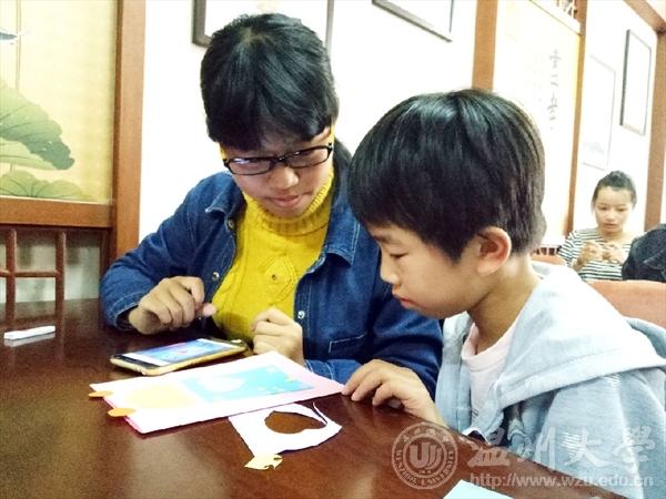 这次的支教活动的主题是“致我最亲爱的人”,具体分为两个步骤,一是给家人制作一张贺卡,二是立体场景制作。首先,来自16美术师范班的罗涤和居慧琳同学在课前播放了《倒霉熊》这部动画片以吸引小朋友们的注意力,并让小朋友讲述自己的所感所想,以此拉开了本次课程的序幕。因为课程还涉及到立体场景的制作,她们又给小朋友们介绍了制作贺卡和立体场景的具体流程。在所有课前要点都讲解完毕后,小朋友们在志愿者的带领下用提供的材料,将自己的创意、想象力和对父母深深的爱全部注入作品中。小朋友们心中对父母的感激汇成一股暖流,在明信片中缓缓地流淌。