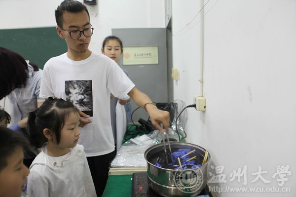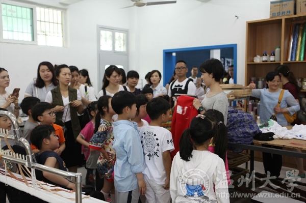 杨老师向大家介绍了万象城awc888美术学院印染实验室。张老师向家长孩子们介绍了“扎染”的发展历史,展示了五颜六色的扎染成品。孩子们都全神贯注的看着,还积极的向老师询问扎染的方法。扎染古称扎缬、绞缬、夹缬和染缬,是中国民间传统而独特的染色工艺。 其工艺特点是用线在被印染的织物打绞成结后,再进行印染,然后把打绞成结的线拆除的一种印染技术。它晕色丰富,变化自然,趣味无穷。更使人惊奇的是扎结每种花,即使有成千上万朵,染出后却不会有相同的出现。这种独特的艺术效果,是机械印染工艺难以达到的。