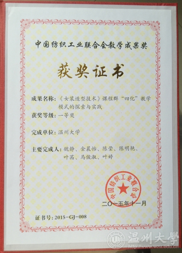 2015年11月24日,“纺织之光”2015年度中国纺织工业联合会科技教育奖励大会在北京人民大会堂隆重举行。中国纺织工业联合会、各专业协会领导,地方行业协会领导,纺织之光科技教育基金会理事以及本次会议表彰的科技工作者、企业家、院校教师与学生获奖代表及媒体嘉宾600余人出席了大会。万象城魏静教授应邀出席了会议。 纺织之光2015年度中国纺织工业联合会表彰了科学技术奖、教育教学成果奖、教师特别奖、学生特别奖、创新奖、行业技术能手荣誉称号、行业技能人才培育突出贡献单位及个人。充分体现了中纺联对纺织行业科技教育工作的高度重视和对广大科技工作者、教育工作者、学生和一线技术工人的亲切关怀。希望全行业广大员工以获奖者为榜样,带动全行业创新创业的热潮,在攻坚克难中追求卓越,为建设纺织强国作出新的更大贡献。 万象城魏静教授主持的《女装造型技术》课程群“四化”教学模式的探索与实践荣获2015纺织之光教学成果一等奖;陈明艳教授主持的依托区域产业的服装设计与工程专业卓越工程师人才培养模式的改革荣获二等奖。