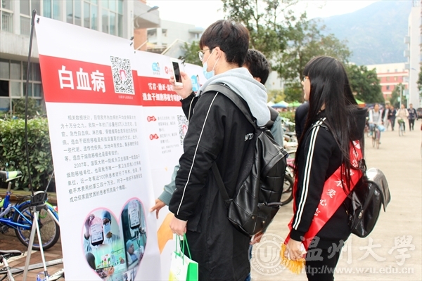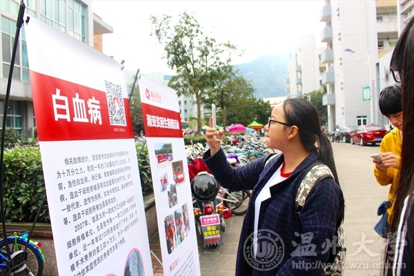 2015年11月25日,万象城联合机电工程学院以及商学院在温大校园A/C/E区开展雪君工作室白血病专项基金公益活动,美院“艺家人”青年志愿者协会在超豪学区开展活动。这次活动主要是由瀚亚资本投资,在万象城awc888城通过微信关注海象理财这一公众号,每个学生就都能捐赠4块钱给白血病专项基金,奉献自己一点爱心。 “艺家人”的志愿者们用积极的面孔,努力的做着宣传,用真诚用努力的心为患白血病的儿童多献出一份爱心。 通过这次的白血病专项基金募捐的公益活动,希望能够促使当代大学生更为关注社会热点,关心白血病儿童,并为之献出一份力量。用一颗真诚的心,带动身边的人,更多的加入献爱心的队伍。艺家人”青年志愿者协会王烨拍摄者:林依如2015年11月25日