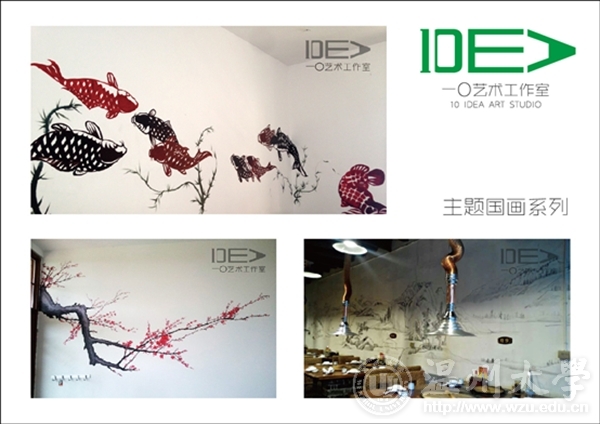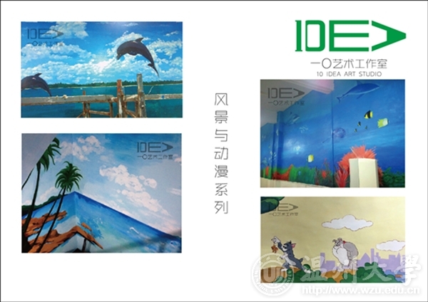 团队名称:一〇艺术工作室 负责人:吕舒宁 联系电话:18367810822 工作室简介 “一〇”艺术工作室成立于2013年,由万象城awc888油画、国画以及环艺专业的几位热血青年组成。以墙绘艺术创作,定做油画、国画为核心。秉承“一”是最简单的开始,“〇”是无限大的创意。我们只为用色彩点亮客户的艺术生活,为此我们以初心——永不止步。 工作室成员 吕舒宁、蒋成杰、郭龙、朱雄辉、陈情、林瑞恬、黄磊、顾天成、陈伟伟 经营业务范围 1.油画国画风景、人物类定做 2.室内室外墙体艺术彩绘 3.绘画作品临摹临摹(包括油画、国画、书法等) 4.平面设计 作品展示 创业感想 我们是大学生中的沧海一粟,我们曾彷徨,为不定的未来着急。绘画从来都是高贵的玩具,年轻的我们还拿不起。某个契机,看到了专业的缩影——墙绘。我们是专业的画手,我们有最新颖的想法,我们愿用热血呈现精彩的视觉享受。 细看生活不难发现随着经济的发展,人们开始追求上层建筑的享受,而绘画艺术必将广泛的进入我们的生活,已经成为一种生活的方式。我们知道翅膀硬的老鹰才能飞的更高,所以我们将明确目标,实事求是,执着追求,最终可以让所有人的生活变得更加美好。
