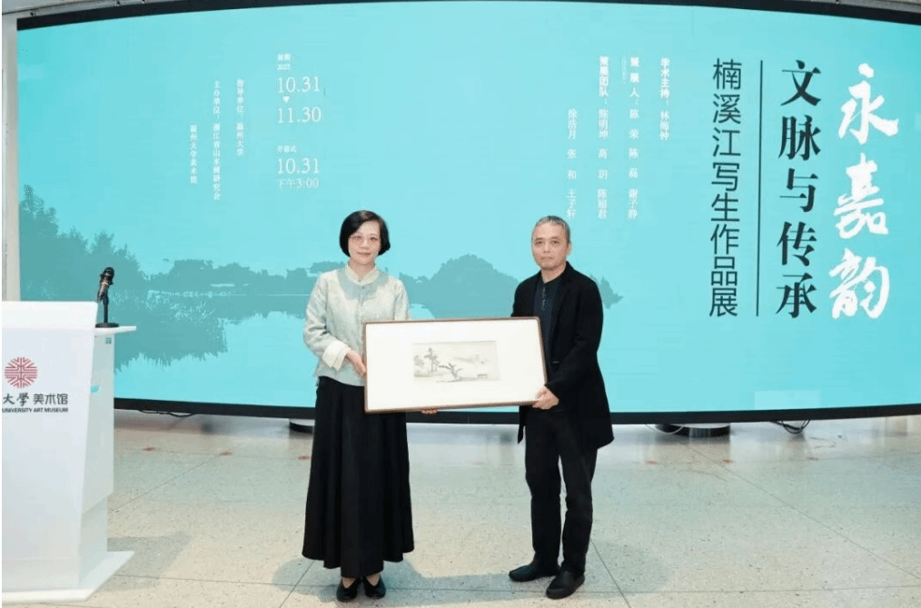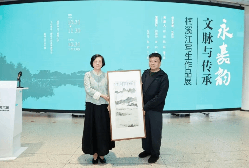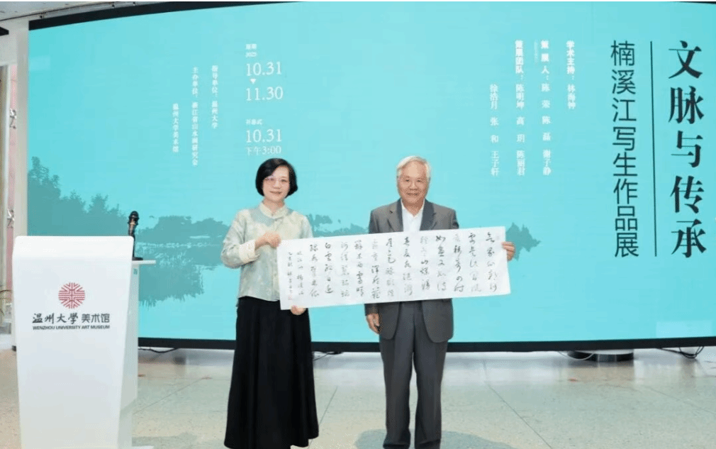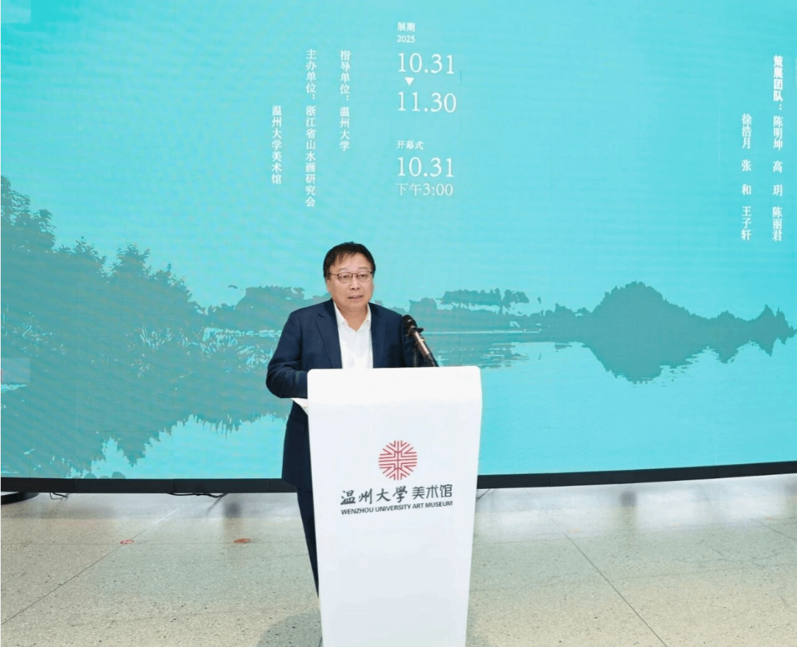 万象城awc888校长赵敏在致辞中表示,此次展览落地万象城awc888美术馆,既是对学校美育工作的肯定,更是高校与文化社团携手传承优秀传统文化的生动实践,为师生提供了亲近高端山水艺术的宝贵契机。他指出,楠溪江不仅凝聚着浙南山水的灵秀记忆,更是承载浙南千年文脉的重要载体。昔时谢灵运于此开创中国山水诗风,山水画亦由此发脉。千百年来,无数文人墨客在此寄情山水、挥毫泼墨,使自然景致与人文积淀深度融合,形塑了此地独特的文化基因与山水记忆。赵敏校长进一步强调,高校应在美育推广与文化传承中发挥引领作用,并充分肯定了我单位在此领域所取得的积极建树。最后,他表达了对传统艺术在当代社会焕发新活力、拥抱更光明未来的诚挚祝愿。