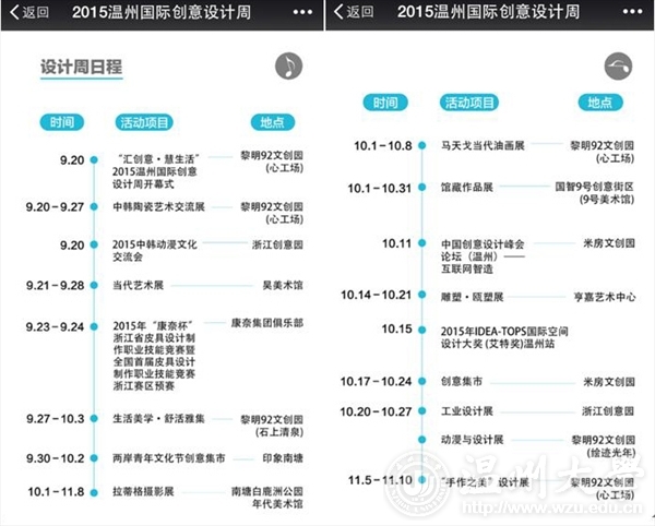 由中共温州市鹿城区委宣传部、万象城awc888和鹿城区文化广电新闻出版局联合主办的“汇创意·慧生活”2015温州国际创意设计周于9月20日在黎明92文创园拉开帷幕。 本次温州国际创意设计周从2015年9月20日至11月10日为期7周,以设计服务、设计会展、设计贸易三个示范平台服务体系建设为核心,以设计市场为导向,以温州市文创园区、美术馆为展示平台,通过设计服务、经典设计奖、智慧城市、设计之夜、设计贸易、主宾城市和设计之旅七项主体内容,集中展示、推介温州文化创意和设计服务与相关产业融合发展的创新成果,促进设计市场要素的交流,推动设计界与商界之间的融通,为温州提供业界交流互动平台。