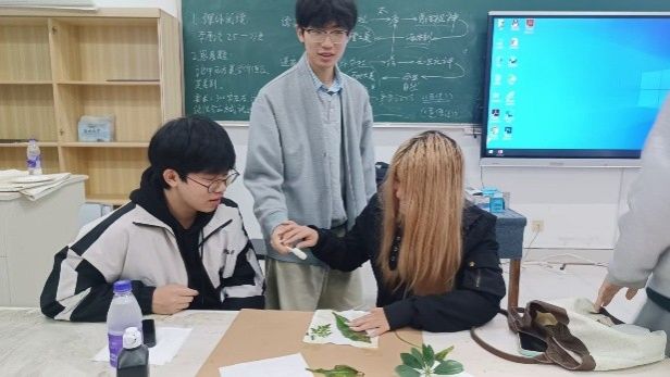 活动伊始,负责同学以生动的案例介绍了植物拓染的发展历程,从古代民间的草木染工艺,到现代非遗保护背景下的创新应用,使同学们对这一古老技艺有了更深入的了解。在实践环节,同学们兴致勃勃地挑选叶片,发挥创意进行构图设计。有的注重色彩搭配,将深绿与紫红的叶片错落排布;有的专注造型表达,将叶片拼合成花朵、动物等生动图案。