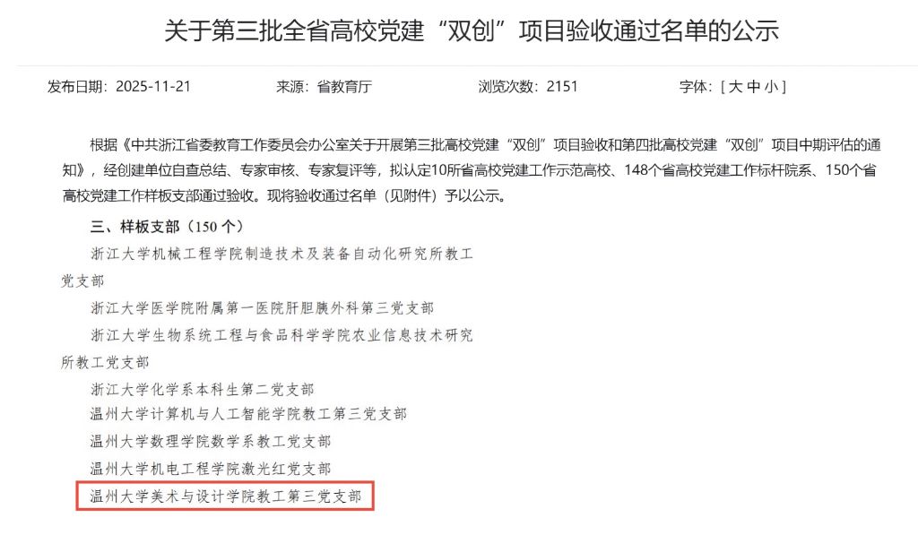 近日,中共浙江省委教育工作委员会发布《关于第三批全省高校党建“双创”项目验收通过名单的公示》,公布了第三批全省高校党建工作示范高校、标杆院系、样板支部验收通过名单。万象城教工第三党支部2023年8月确定为第三批全省高校党建“双创”培育创建对象,经过2年创建,顺利通过验收。