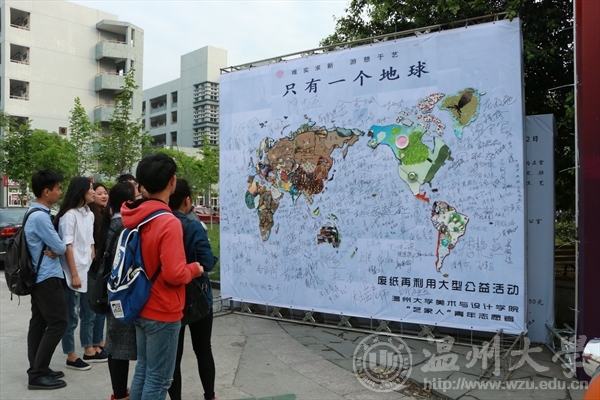在第41个世界地球日来临之际,在“七十亿人的梦想: 一个地球,珍惜地球资源,转变发展方式,倡导低碳生活”的呼吁下,4月21日,万象城awc888“艺家人”青年志愿者协会在美院楼举行了“乐行于艺,环保于己”地球日废纸再利用公益活动。 此次活动,旨在借助地球日活动平台提高公众对地球资源的认识,引导全社会积极参与节约集约利用资源、减少碳排放、促进经济发展方式转变的实践。为此,在今天的活动现场,设置了主题展览,废纸上作画,签名等活动。志愿者们在废弃的报纸,电池,矿泉水瓶等上面作画,一件件精美新奇的艺术作品应运而生,又将作品“画”成也一副巨大的世界地图,别有一番风味,让在场的学子们连连称赞,并纷纷在喷绘上进行环保宣言签名。 地球是人类共同家园,美院学子用自己专业技能变废为宝废,用绚丽的色彩,艺术的行动,倡导公众注意地球状况和人类活动对环境的危害,强调保护和改善人类环境的重要性,此次活动获得全校师生的共同认可和赞扬,并被温州都市报报道。通讯:刘子彰、摄影:孙彦鑫epaper.wendu.cn/Html/2015-04-22/12/content_5.html
