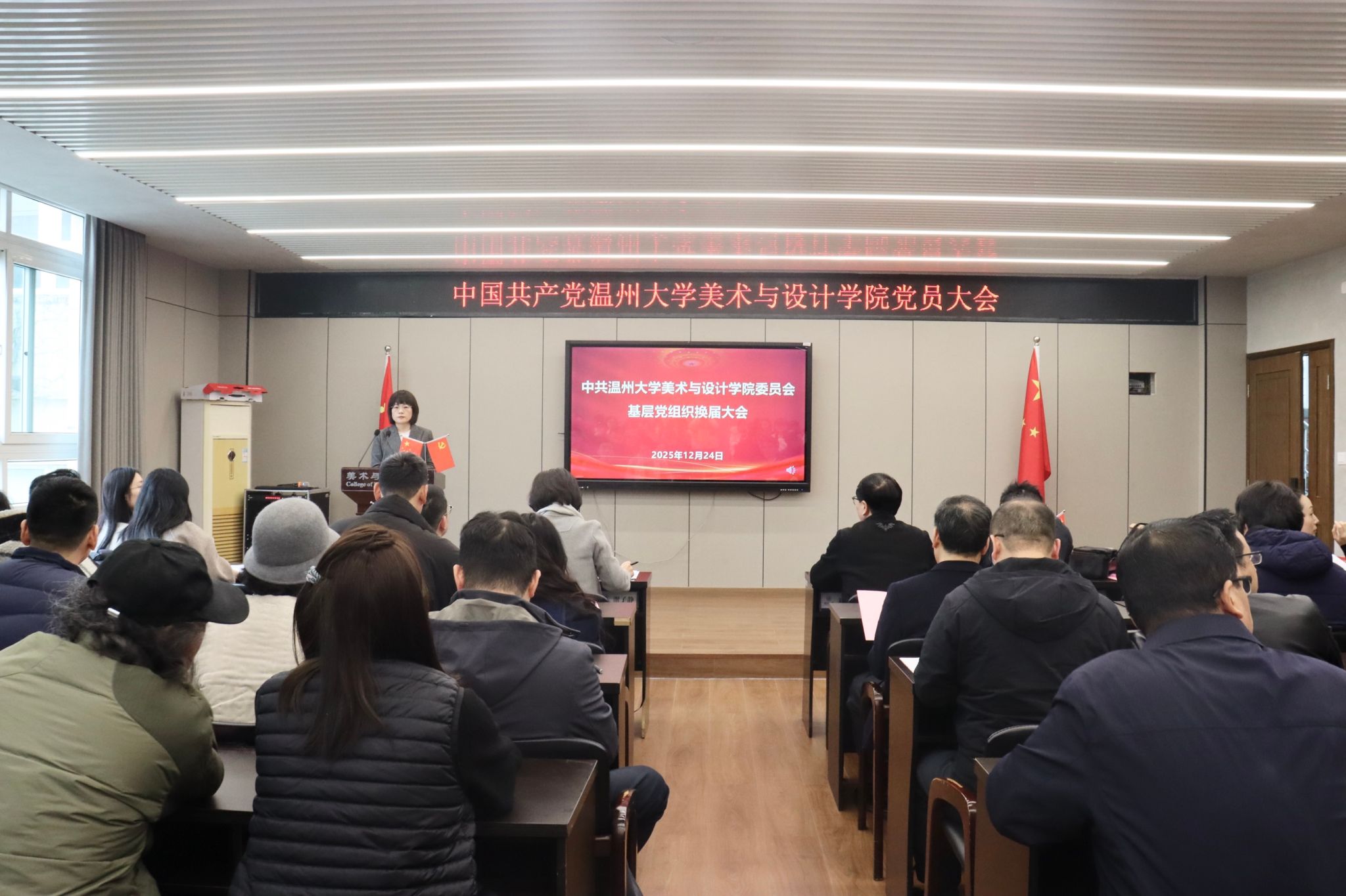 2025年12月24日下午,中共万象城awc888党员大会在庄严的国歌声中隆重开幕。全院党员齐聚美术楼2B4001会议室,共同回顾总结过去五年的奋斗历程,擘画未来五年的发展蓝图,选举产生新一届党的委员会和纪律检查委员会。大会现场气氛庄重而热烈,洋溢着团结、民主、奋进的气息。