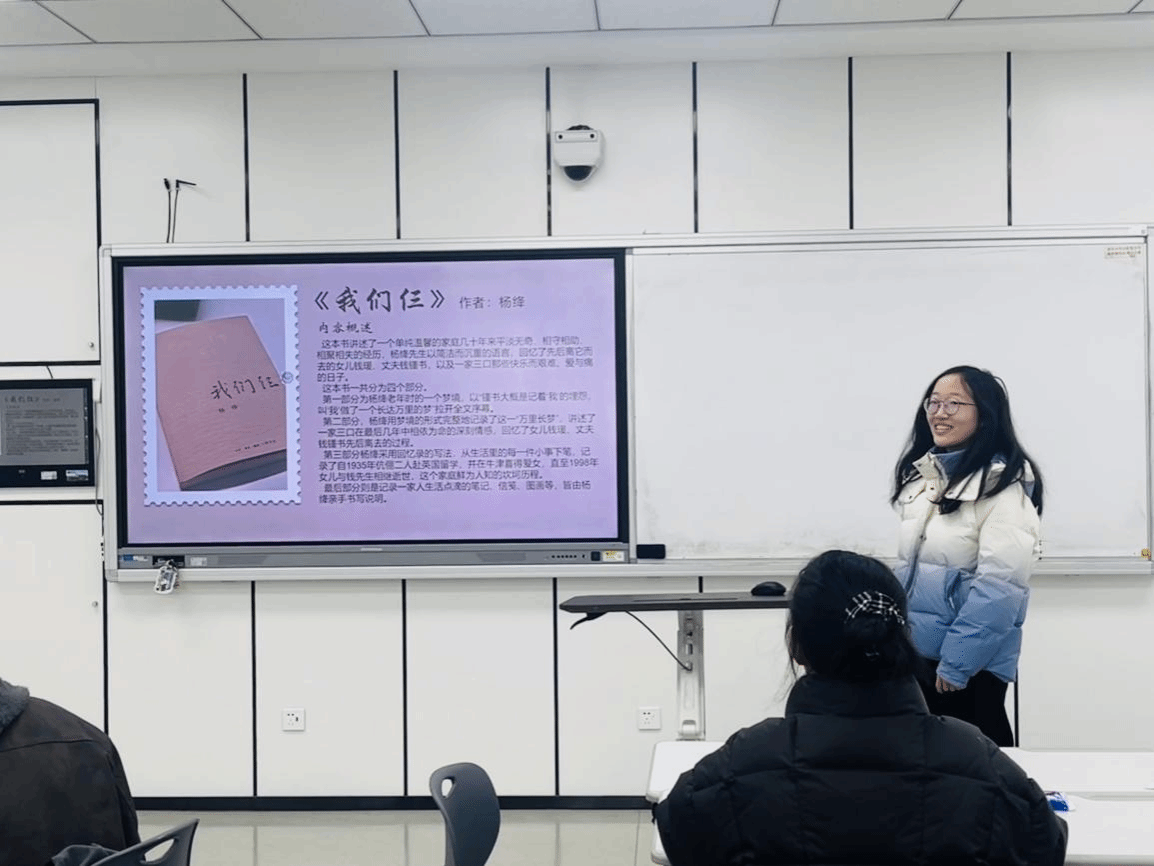 《追风筝的人》中那句“为你,千千万万遍”,轻轻叩击着每个人的心,友谊的纯粹与救赎的重量,让人默然心动;《祝福》里祥林嫂的命运,则牵引出深深的悲悯与对社会陋习的沉重反思;《城南旧事》借小英子的眼睛,铺展出一幅充满人情味的老北京画卷,读者仿佛也随她一同经历那些细碎的悲欢;《狼王梦》中梦想与亲情的纠葛、生存法则的残酷,引人陷入对坚持与牺牲的沉思;《一食一味》里,汪曾祺笔下寻常的咸鸭蛋、汽锅鸡,飘散出故乡与文化的香气,那份对生活朴素而通透的热爱,悄然抚慰着人心;《我们仨》里,杨绛先生用简洁而沉重的笔触写尽家的温暖与离散的苍凉,“世间好物不坚牢,彩云易散琉璃脆”——这份感慨,久久萦绕在听者心头,引人珍惜眼前点滴。大家静静聆听,不时提笔记下心动的书名,整间教室弥漫着思考的宁静与共鸣的暖意。