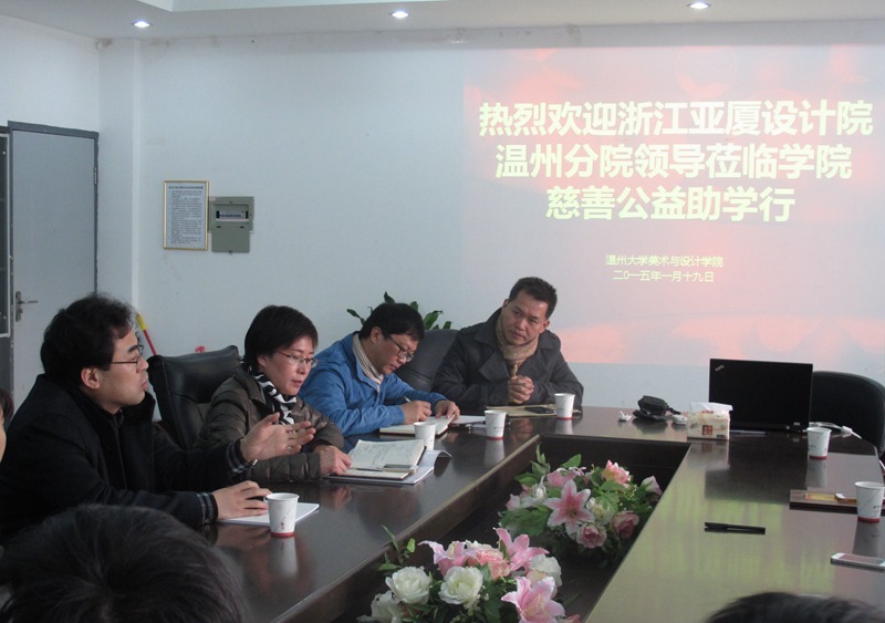 万象城awc888自2014年4月与亚厦温州设计院签定合作协议以来,双方在项目教学、实习就业、人才培养等方面开展了深入的合作。近日学院王剑峰同学在亚厦温州设计院实习,表现优秀!不料其父亲因意外出车祸并未找到肇事者,高额的医疗费让这个普通的家庭陷入困境。当亚厦院长慈善基金会秘书处得知这一消息后,提议首次启动“院长慈善公益基金会”。1月19日上午,“亚厦院长慈善公益基金会”胡逸理事长、梅笑天副理事长、胡世列常务理事等一行来到万象城awc888开展慈善公益助学活动,捐赠一万元爱心款帮助这个普通家庭慢慢走出困境!传递出设计院全体同仁的浓浓爱心和关怀!出席仪式的有学院李运河院长、郑彩莲书记、杨振海副书记、办公室李丽主任、设计系朱广宇主任、学生科叶如芳科长以及在亚厦温州设计院实习的11环艺班的同学代表。杨振海副书记主持仪式。