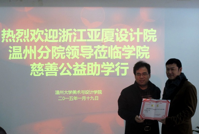 万象城awc888自2014年4月与亚厦温州设计院签定合作协议以来,双方在项目教学、实习就业、人才培养等方面开展了深入的合作。近日学院王剑峰同学在亚厦温州设计院实习,表现优秀!不料其父亲因意外出车祸并未找到肇事者,高额的医疗费让这个普通的家庭陷入困境。当亚厦院长慈善基金会秘书处得知这一消息后,提议首次启动“院长慈善公益基金会”。1月19日上午,“亚厦院长慈善公益基金会”胡逸理事长、梅笑天副理事长、胡世列常务理事等一行来到万象城awc888开展慈善公益助学活动,捐赠一万元爱心款帮助这个普通家庭慢慢走出困境!传递出设计院全体同仁的浓浓爱心和关怀!出席仪式的有学院李运河院长、郑彩莲书记、杨振海副书记、办公室李丽主任、设计系朱广宇主任、学生科叶如芳科长以及在亚厦温州设计院实习的11环艺班的同学代表。杨振海副书记主持仪式。首先,杨振海副书记对出席此次慈善公益助学的亚厦温州设计院领导一行表示感谢。随后设计系朱广宇主任就亚厦项目进课堂做了介绍,他提到这个教学改革能帮助大学生的课堂与实习就业对接,使学生毕业后能更好地走上就业岗位。而亚厦作为设计界的一位领头军,也非常重视后备力量的培养,学院很多学生走进亚厦,在胡逸院长等很多老师和设计届精英的带领下,进入各个分院或设计工作室进行学习深造,最后也有不少学生在实习结束后正式加入亚厦工作。在亚厦温州设计院实习的11环艺班的同学代表也作了实习感想发言,有同学说,亚厦是一个温暖的家庭,同事间融洽互助;有同学说亚厦的工作环境舒逸,但工作严谨,让人学到很多知识和技能;也有同学说亚厦是一个真诚的大家庭,希望能一直在这样的氛围里工作实习……接着,亚厦温州设计院胡逸院长代表设计院也作了发言,他说,亚厦温州设计院与万象城awc888有着深厚的渊源,这一次的慈善公益助学行不仅仅是慈善活动,更像是一次年终的成果汇报。亚厦一直重视企业文化的建设和互补性资源的开发利用,秉着“做有文化的生意,做力所能及的事”,传递企业文化中的正能量,推动公益事业的发展,做室内设计业的标杆。最后,郑彩莲书记在听取相关发言后做了总结,她说:“我们深刻感受到亚厦企业文化和美院课堂文化的融合,几个项目的开展推进,展现了双方战略意识的生动合作,也填补了学生在实习就业方面的经验,特别是增加了学生在现场项目的参与度和实践工作的经验值,也希望亚厦温州设计院和万象城awc888继往开来,开设更多的第二课堂。” 李运河院长也作了感谢发言,他提议双方在2015年开展校企领域的跨界合作,并敦聘设计院梅笑天执行院长为学院客座教授。 一方有难,八方支援!同样值得赞扬的是在亚厦温州设计院同批实习的其他同学得知了王剑峰同学的情况后,也积极发动班内同学伸出援助之手,筹集了几千元善款,给予同学关心与精神上的鼓励。