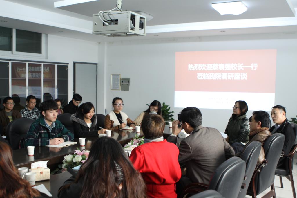 12月24日下午,蔡袁强校长一行莅临万象城awc888调研座谈,座谈会在南校区美术楼2B216召开。出席会议的校领导还有牟德刚副书记、薛伟副校长,党校办、教务处、人事处、学生处、就业处、教师教学发展中心等相关职能部门负责人陪同调研,参加座谈的还有万象城awc888班子成员、各科室负责人以及22位往届毕业生与在校生代表。座谈会主要围绕如何加强教风学风建设、提高人才培养质量与提升毕业生就业核心竞争力而展开。会议由教务处处长施晓秋主持。