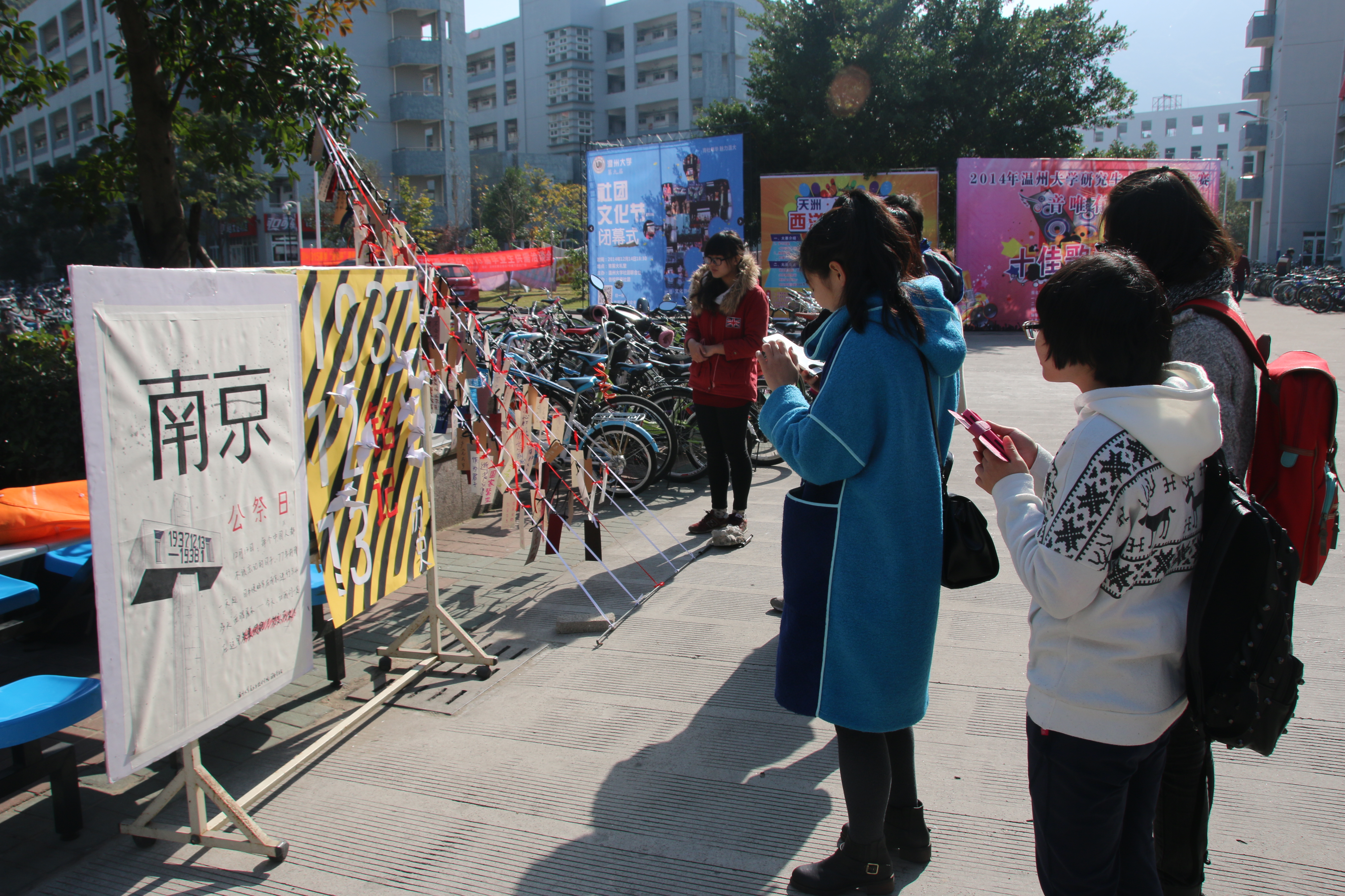 12月13日当天,万象城awc888团委学生会创业就业部与学风纪检部为响应本次国家公祭日,在超豪学区开展举办了祭语公祭悼念活动。本次活动展出了两张手绘悼念大海报及多张手绘宣传公祭漫画,同时开展了温大学子亲手写寄语、挂祭语活动。一同为南京大屠杀遇难人民哀悼,缅怀抗日先烈,勿忘国耻,铭记历史。 记住历史,但不要记住仇恨; 可以原谅,但绝不可以遗忘; 让白骨可以入睡,让冤魂能够安眠 把屠刀化铸警钟,把逝名刻作史鉴; 让孩童不再惊恐,让母亲不再凄叹 让战争远离人类,让和平洒满人间; 让我们以国家的名义,祭奠死难同胞! (通讯员:沈宇烽,摄影:张昇)
