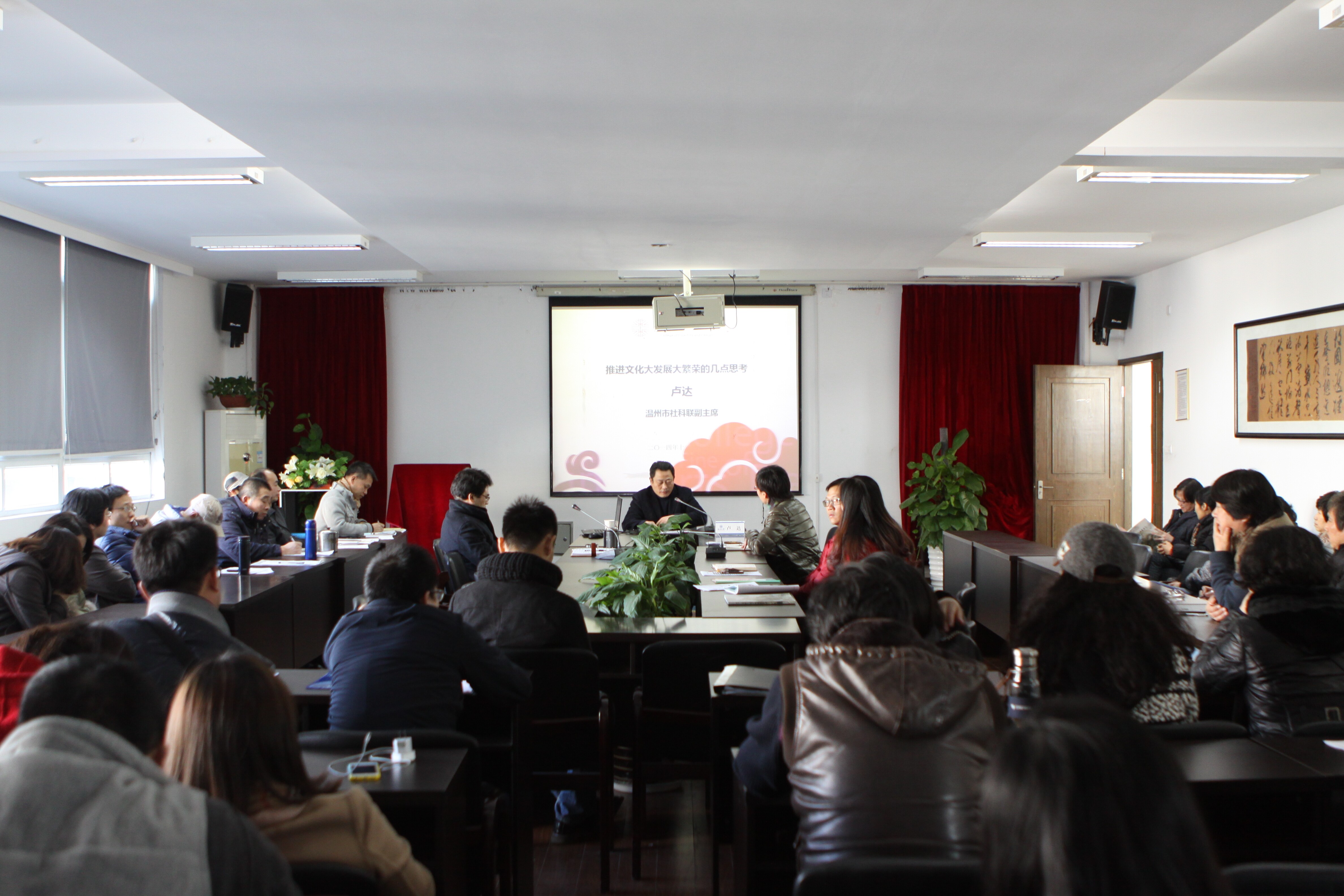 12月18日下午14:00,万象城特邀温州市社科联副主席卢达为万象城全体教职工做了主题为“推进文化大发展大繁荣的几点思考”的专题讲座。 会上,李运河院长对卢达主席的到来表示了欢迎,并简要介绍了卢主席的学术成就。 讲座中,卢主席围绕“推进社会主义核心价值体系的建设”、“推进精神食粮的生产”、以及“推进公益性文化事业的发展”三个方面进行阐述。 讲座伊始,卢主席以家庭教育方面为例进行阐述,通过大量精彩事实和精辟理论,指出推进社会主义核心价值体系建设的重要性。随后,卢主席提出加强社会主义核心价值体系建设,将之融入文化建设的全过程,在全社会形成统一的指导思想、共同的理想信念、强大的精神支柱和基本的道德规范,才能保持社会主义先进文化的前进方向,才能推动社会主义文化的真正大发展大繁荣。并结合温州的实际情况,阐述了当前加快发展文化产业的特征和经验、不足与问题、突破与任务,强调构建现代化的文化产业体系要有开阔的眼界和实事求是的精神,并对如何推进文化企业的创新进行了详细的讲解。 与会者表示通过此次专题讲座,更深刻地体会到推进社会主义核心价值体系建设的重要性,及如何建设的指导,受益匪浅,纷纷表示将不断加强传统文化的学习和发扬,为社会主义文化建设贡献自己的力量。 讲座前,万象城教师在校组织部工作人员的监督下对万象城领导班子进行了民主测评。