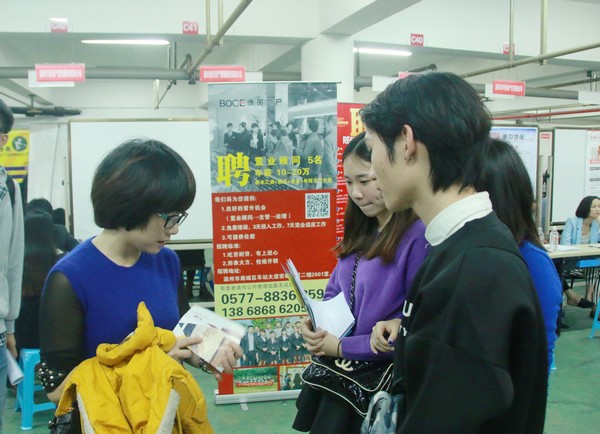 两位老师的鼓励下,同学们大胆地与用人单位交流,在紧张的招聘氛围中坦然寻觅自己合适的岗位。