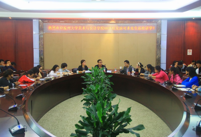 讲座开始前,郑彩莲书记对汤可术的创业经历、人生成就做了简单的介绍,并对他的到来表示由衷的期待和热烈欢迎。接着,汤可术先生为美院师生们带来了一场内容丰富、思想深刻的讲座——“汤可术与他的三个愿望”。